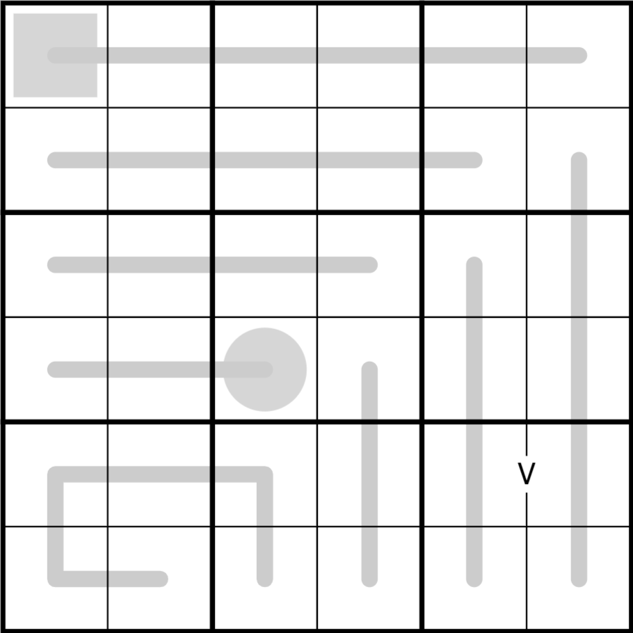 Place the digits 1-8. All digits n must appear n times in the grid. Digits cannot repeat in a region. Digits may appear a maximum of twice in every 3x3 quadrant. There must be a gap of three or more cells between every pair of identical digits. Middle digits (4,5) cannot appear in the middle columns (3,4). Each line is either a Renban line or a German whispers line. Digits on a Renban line are consecutive, in any order. Adjacent digits on a German whispers line must have a difference of at least 5. Digits cannot repeat on a line. A circle indicates an odd digit. A square indicates an even digit. Digits next to a V must sum to 5.