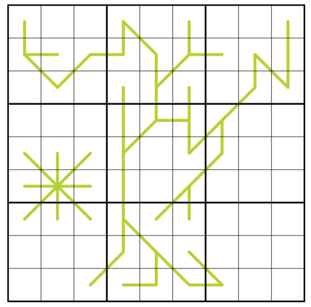 - Whispers: Values of adjacent cells on a greenish line must have a difference of at least four and a half.