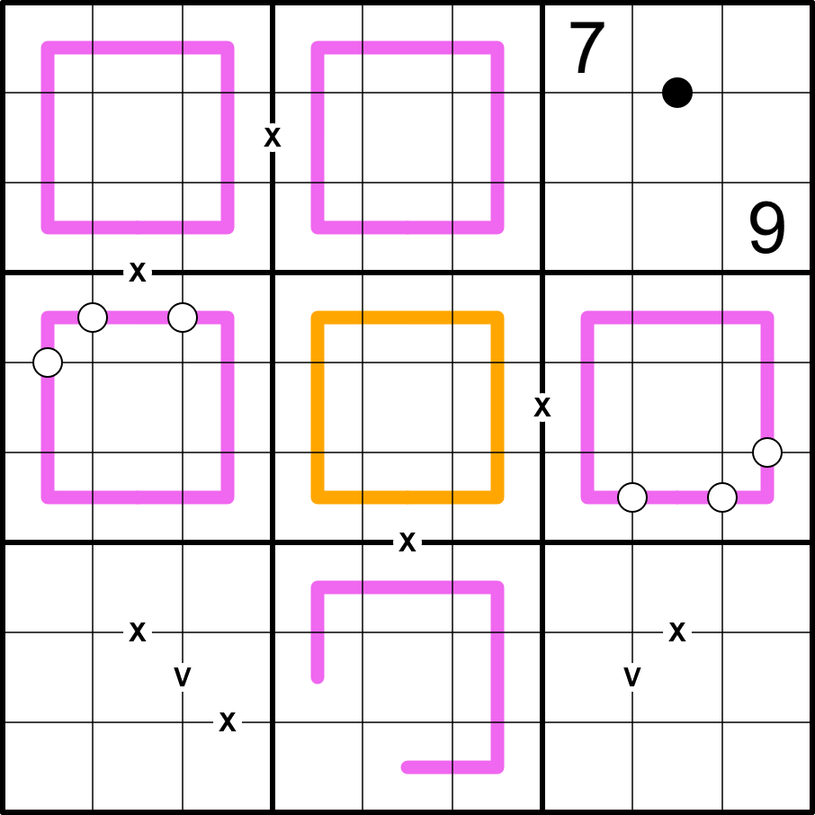 Kropki dots: Cells separated by a white dot differ by exactly one. Cells separated by a black dot are exactly double. Not all kropki dots are given.