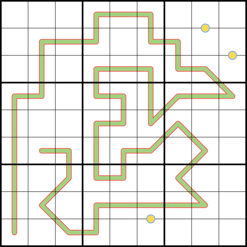 Region Sum Thermometer: Region borders divide the green line into segments. The sum of digits on each segment strictly increase in value along the line (direction must be deduced by the solver).