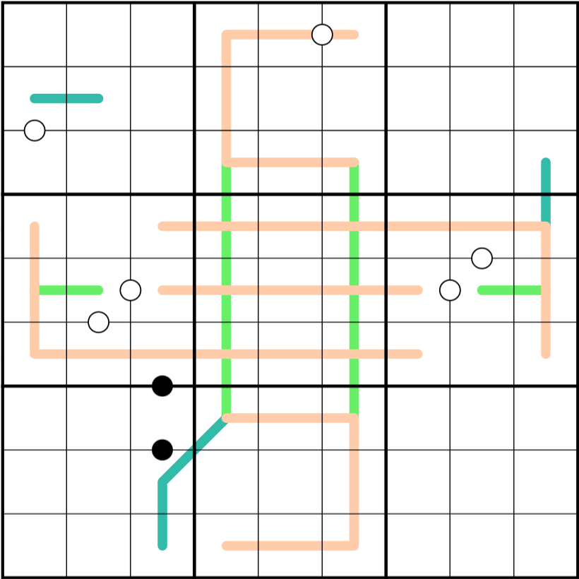 Modular Lines: Every set of 3 digits along a teal line must include a [1,4,7] [2,5,8] and a [3,6,9]