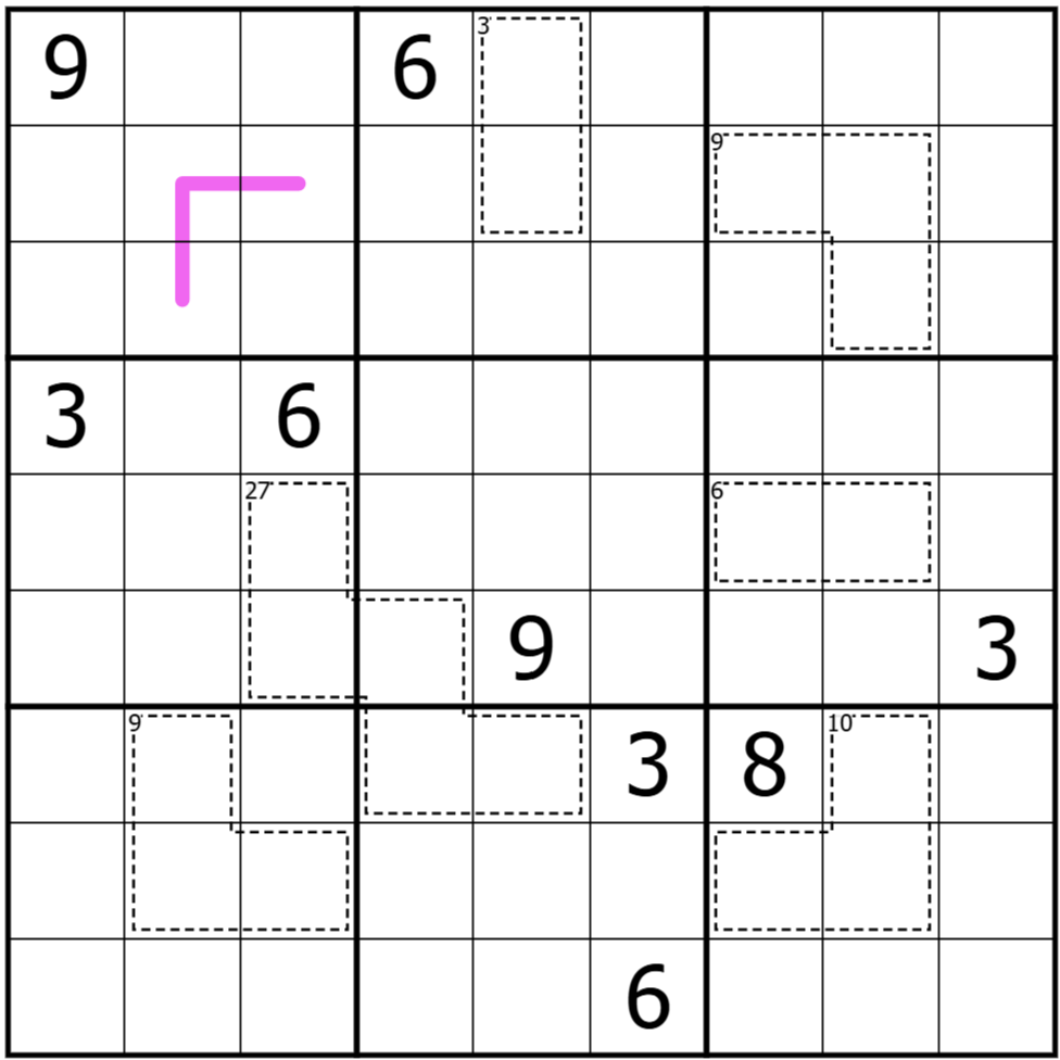 Die Summe der Ziffern in einem Käfig ergibt die angegebene Zahl. Ziffern dürfen sich in einem Käfig nicht wiederholen.