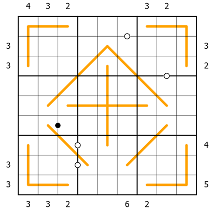 Kropki Dots: Digits separated by a white dot have a difference of one, digits separated by a black dot have a ratio of 2:1.