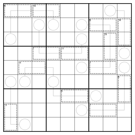 Cages: Digits in cages sum to the total in the upper left corner of the cage.