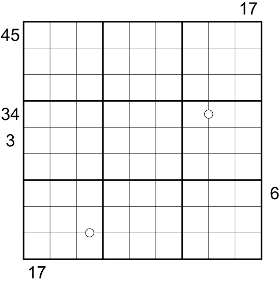 This is my entry for turn 6 of season 1 of The Skunkworks League, hosted by damasosos92. In this round, the prompt was to create a puzzle in a 9x9 grid that used the winning IDs of the previous rounds (3, 6, 17, 17, 34, 45) as the only numerical clues.