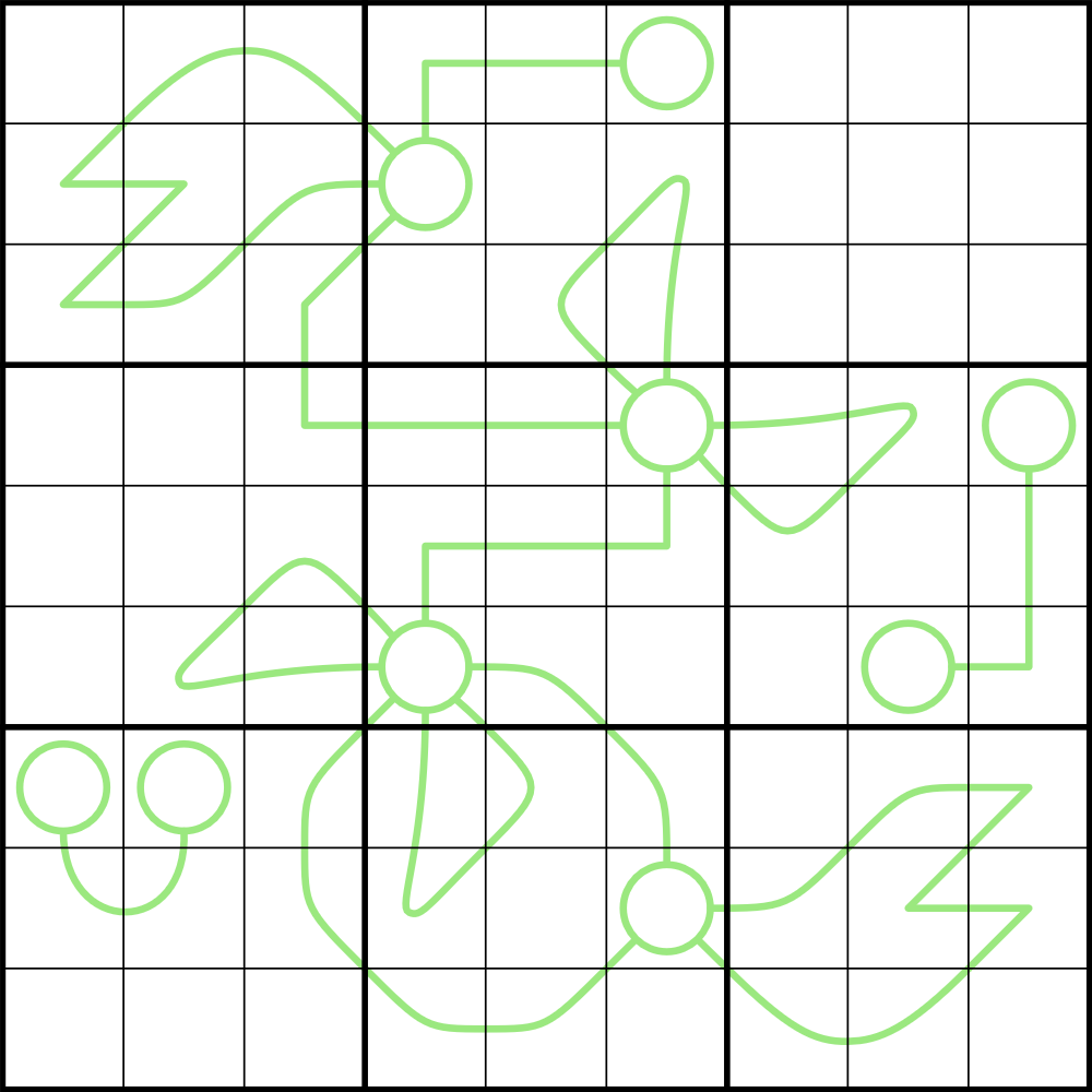 - The digits along a green line sum to a number obtained as a concatenation of the two digits in the circles attached to it, in at least one order.