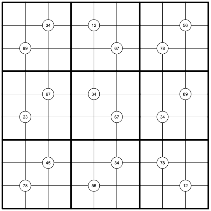 Quadruples. Digits in circles must appear in the four surrounding cells.