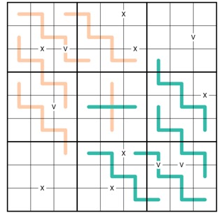 Cells connected by a V sum to 5. Cells connected by an X sum to 10. Not all Xs or Vs are necessarily given.