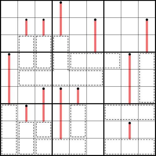 Regeln: Es gelten die normalen Sudoku-Regeln. Jeder Käfig steht für ein Gewicht und jede rote Linie für eine elastische Feder. Das obere Ende jeder Feder ist an dem schwarzen Kreis im Raum fixiert. Ein Gewicht übt eine nach unten gerichtete Kraft auf die darüber liegende Feder aus, mit der es verbunden ist. Diese Kraft ist gleich der Summe der Ziffern des Gewichts. Ziffern dürfen sich innerhalb eines Gewichts nicht wiederholen. Die Ausdehnung jeder im Rätsel dargestellten Feder folgt dem Hookeschen Gesetz: Die Anzahl der Zellen der Feder ist gleich der aufgebrachten Kraft geteilt durch die Federkonstante. Die Federkonstante ergibt sich aus der Summe der Ziffern der Feder. Jedes zusammenhängende Paar aus Feder und Gewicht wird unabhängig von den anderen Paaren behandelt: Es wird davon ausgegangen, dass ein bestimmtes Paar kein anderes Paar beeinflusst, auch wenn es sich in benachbarten Zellen befindet, d.h. Federn sind nicht mit darüberliegenden Gewichten verbunden.