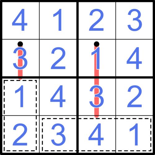 Beispiel: Das folgende Bild zeigt ein vollständig gelöstes Beispiel auf einem 4x4-Gitter. Man kann das Beispiel selbst hier auf SudokuPad lösen.