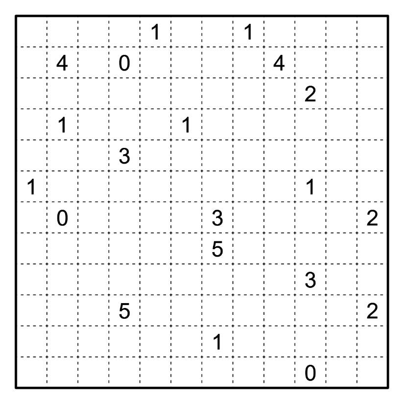 - Heyawake: Shade some cells so that no two shaded cells are orthogonally adjacent and the remaining unshaded cells form one orthogonally connected area. Numbered regions must contain the indicated amount of shaded cells. A line of consecutive unshaded cells may not cross more than one region border.