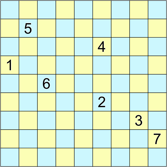 Parity Parity: The grid is covered in a checkerboard pattern of yellow and blue cells. Each digit appears in one of the colors exactly as many times as its value. For example, 7 will appear either exactly seven times in blue or exactly seven times in yellow.