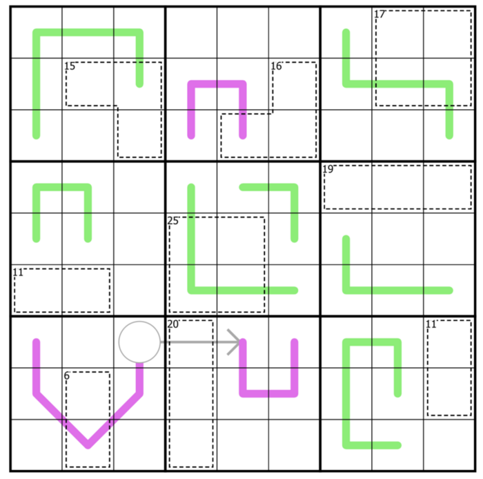 Renban: Eine violette Linie (Renban) muss eine Menge aufeinanderfolgender, nicht wiederholter Ziffern in beliebiger Reihenfolge enthalten.