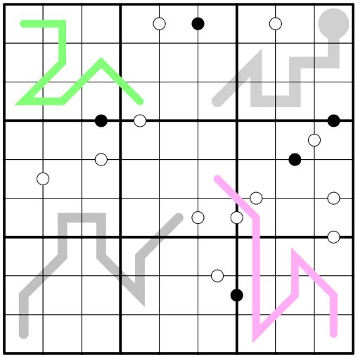 Kropki: cells linked with a black dot have a ratio of 1:2. Cells linked with a white dot are consecutive. Not all possible dots are given.