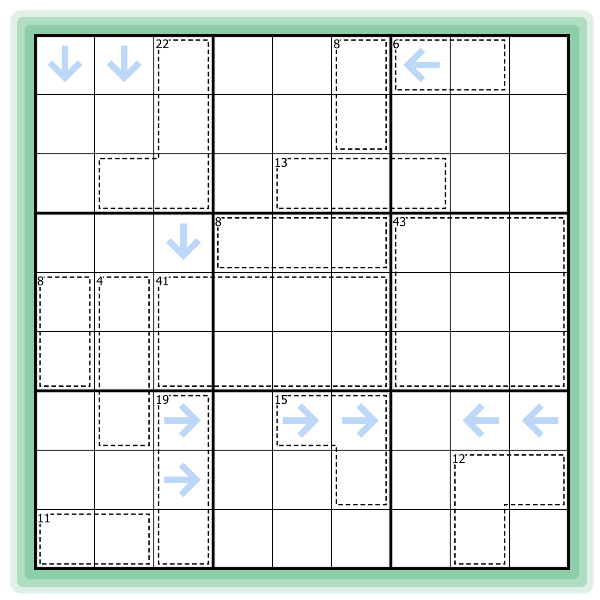 CAGES: Digits in a cage do not repeat, and the clue in the top left corner indicates the total of any digits in the cage that are NOT ON the palindrome.