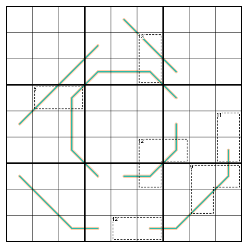 Entropic lines: Any set of three adjacent cells along an entropic line must contain a low digit (123), a middle digit (456), and a high digit (789).