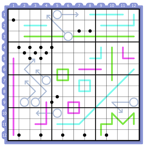 An absolutely magnificent puzzle, easily one of my favorites of the year! I'll definitely admit that this is beyond my usual solving skills so, although I did solve everything logically in the end, I did make liberal use of the Check function along the way to make sure I hadn't taken a totally wrong turn (which I did once or twice). But I'm glad I stuck it out in the end, because this was worth every second of the many hours I spent on it. I hope to see plenty more with this incredible ruleset, and I hope it's half as fun as this one was!
