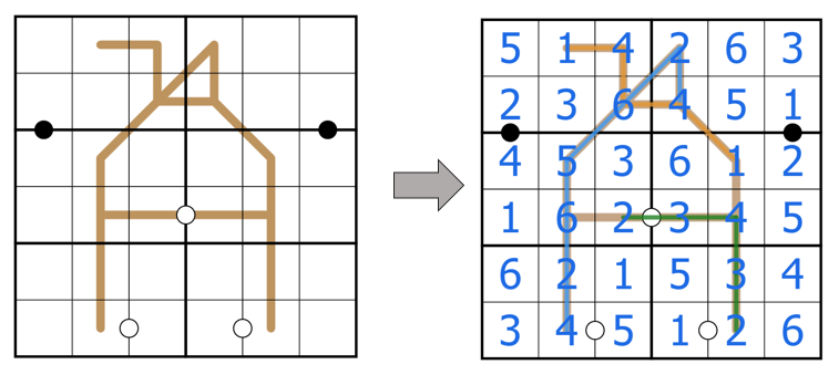 4. BYO Palindromes: A palindrome line is a non-branching line which digits on it read the same forwards and backwards. Draw three different palindrome lines, such that each line starts from one of the ends of the brown line (r1c3, r1c5, and r1c6) and moves along the brown line, visiting at least two cells.
