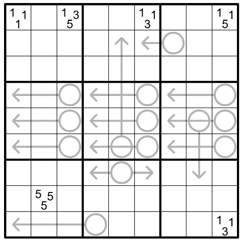 In jeder Zeile, Spalte und 3x3 Gebiet, die Anzahlen der drei Farben muss jeweils 1-3-5 sein (in irgendeiner Ordnung): dass heißt, eine der Farben kommt einmal vor, eine andere dreimal, und die letzte fünfmal. Dabei hat eine Farbe nicht notwendigerweise dieselbe Anzahl in verschiedenen Zeilen/Spalten/Gebieten.