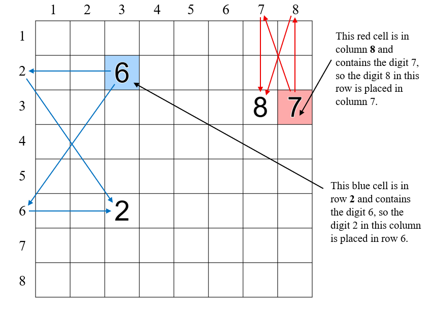 - Column indexers: Red cells are column-indexing cells. A digit in a red cell gives the placement of that cell's column number in its row (see diagram below for example).
