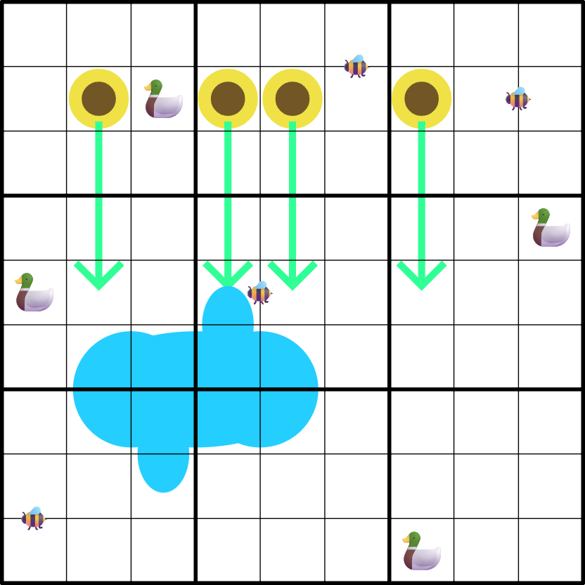 Box borders divide the pond into groups of cells with the same sum.
