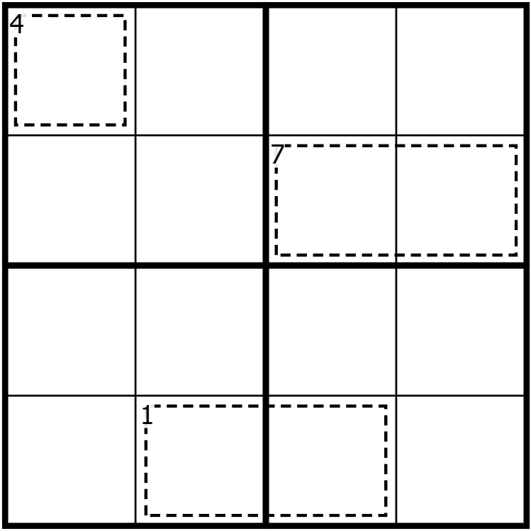 - Normal Sudoku: Place the digits 1-4 in every row, column, and 2-by-2 box.