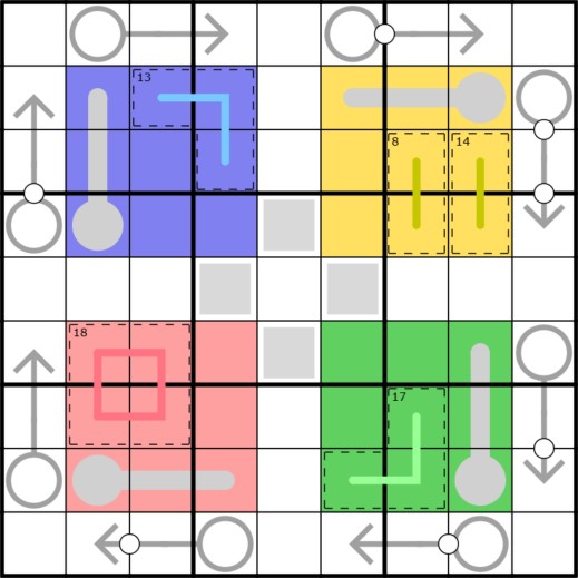 I enjoyed the puzzle, but I appreciated the nostalgia trip more: "Sorry!", as I recall, was a board game of 50-some years ago. It is a variant of Ludo (which, per the wikipedia page, harks back to ancient Parchisi). Anyway, the colour scheme closely replicates (my recollection of) that of my copy of the board.