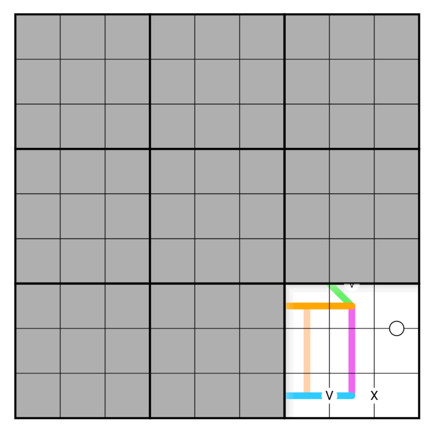 • Digits along a blue line create a sumline where the sum of digits on a line within a particular 3x3 box must be the same for all the boxes the line passes through.