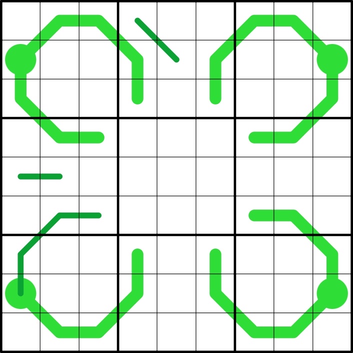 Renban: Digits along a thin, dark-green line form a set of non-repeating consecutive digits in any order.
