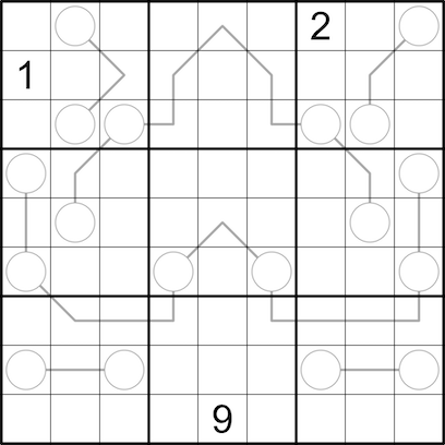 Double Arrows: The lines and circles are double arrows. The sum of the digits on the line must equal the sum of the digits in its end circles. Digits may repeat on double arrows (lines and circles) if allowed by other rules.Example: If two circles containing 5 and 7 are connected by a 3-cell line, the line might contain the digits 2, 4, and 6.