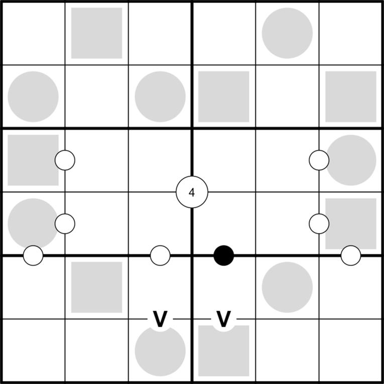 Kropki: Schwarze Punkte verbinden Zellen im Verhältnis 1:2, weiße Punkte verbinden Zellen mit einer Differenz von eins.