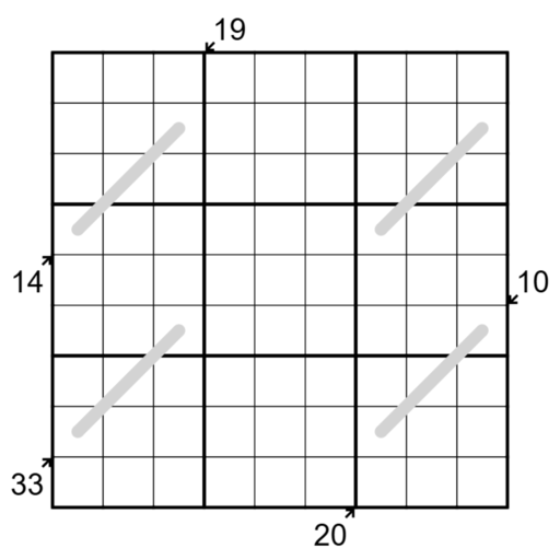Little Killer: The number outside the grid is the sum of digits along the indicated diagonal.