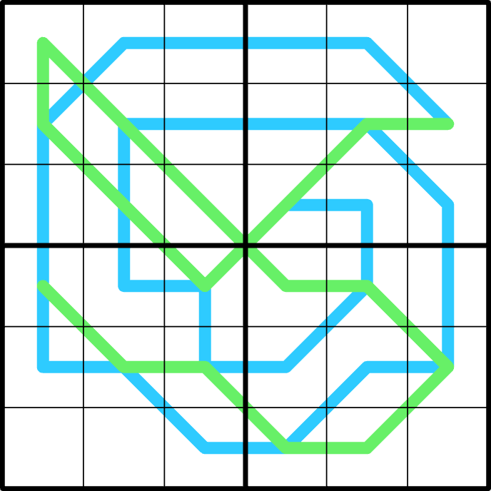 Region sum lines: along the blue line, the sum of digits on each line segment is the same; segments are separated by region borders.