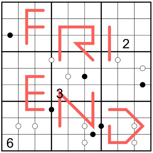 Kropki: Felder, die mit einem schwarzen Punkt verbunden sind, haben ein Verhältnis von 1:2. Felder, die mit einem weißen Punkt verbunden sind, haben eine Differenz von 1. Nicht alle möglichen Punkte sind gegeben.