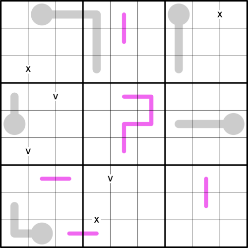 - Cells connected by an X must sum to 10. Cells connected by a V must sum to 5. Not all Xs and Vs are given.