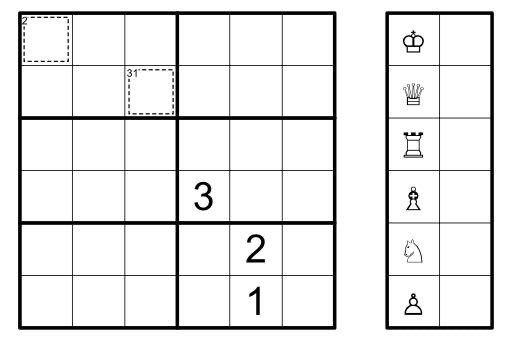 Pawn: Attacks only the diagonally adjacent upper-left and upper-right cells. The pawn in row 1 doesn't attack any cell.