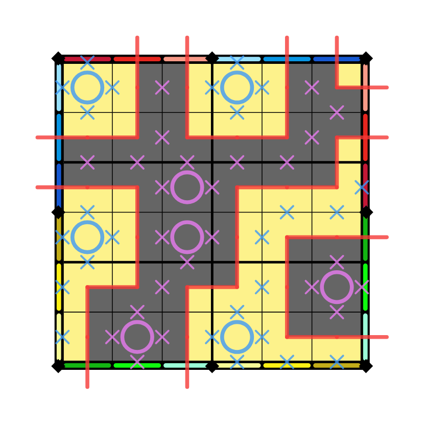 - The grid is a double-torus: the edges of the grid are identified as the coloring indicates (for example, r3c1 is considered orthogonally adjacent to r1c8). Regions wrap around the edges as indicated.