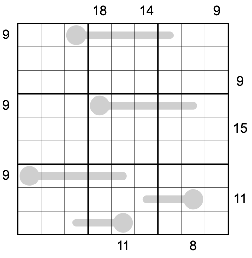 Sandwich: The numbers outside the grid give the sum of the digits between the 1 and the 9 in that row or column.