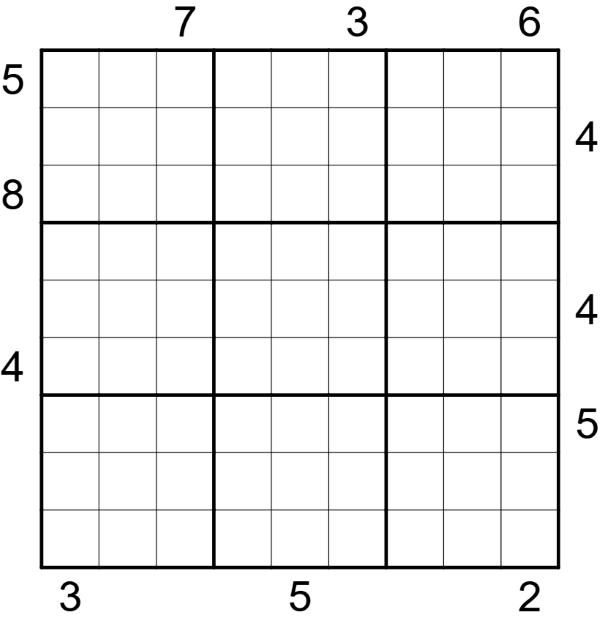 Skyscraper: Jede Zelle stellt einen Wolkenkratzer dar, dessen Höhe durch den Zellenwert angegeben wird. Ein Wolkenkratzer versperrt die Sicht auf alle dahinter stehenden Wolkenkratzer gleicher oder niedrigerer Höhe. Hinweise außerhalb des Rasters geben die Anzahl der Wolkenkratzer an, die aus dieser Richtung in der entsprechenden Zeile oder Spalte sichtbar sind.