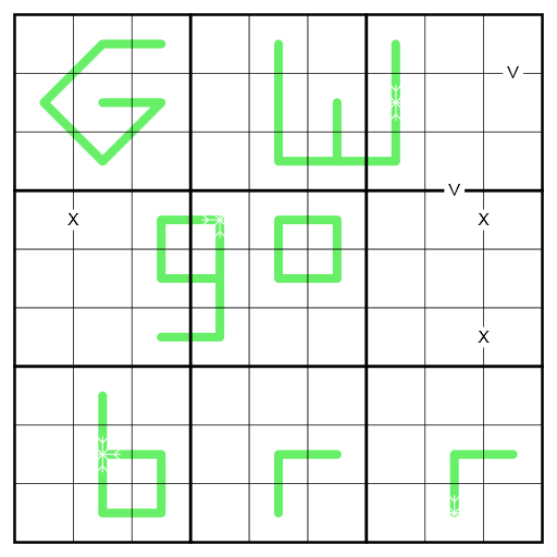 - German Whispers-Linien: Benachbarte Ziffern auf einer grünen Linie haben eine Differenz von mindestens 5.