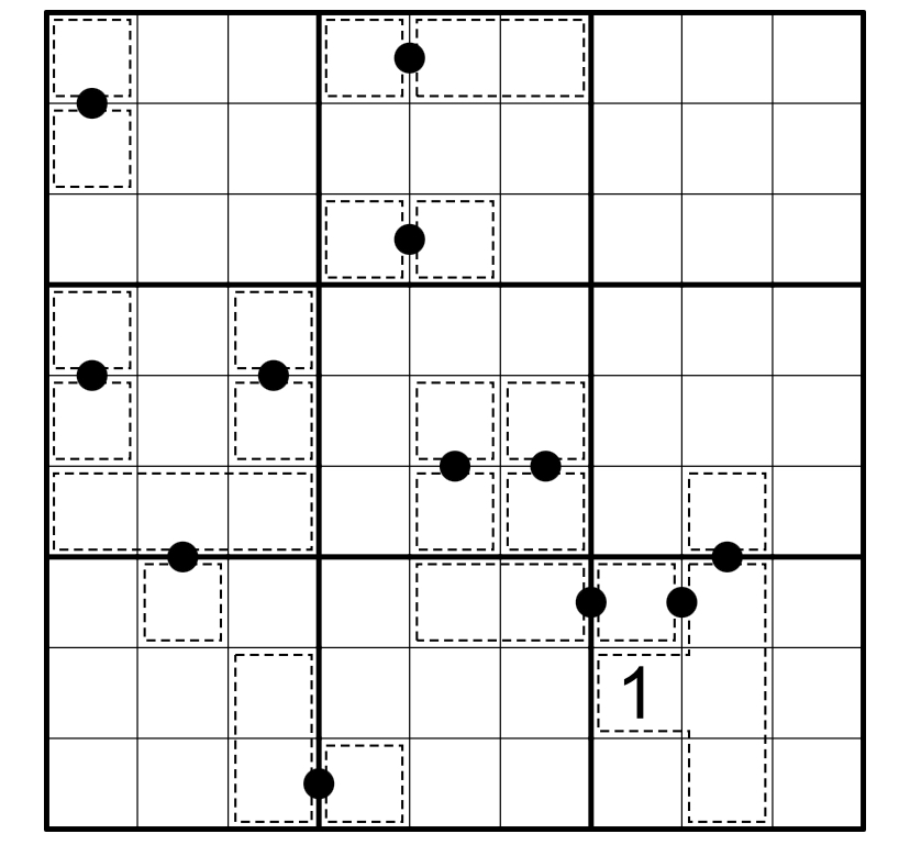 - Crossing boxes: If a Krazy Kropki dot lies on the border between two boxes, the player must determine