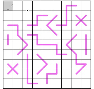 RENBAN: Digits along pink renban lines must be a non-repeating set of consecutive digits, in any order. Note: there are two pairs of renban lines which cross each other creating an X. These lines are to be treated as separate from each other- lines of length 2 rather than length 4.