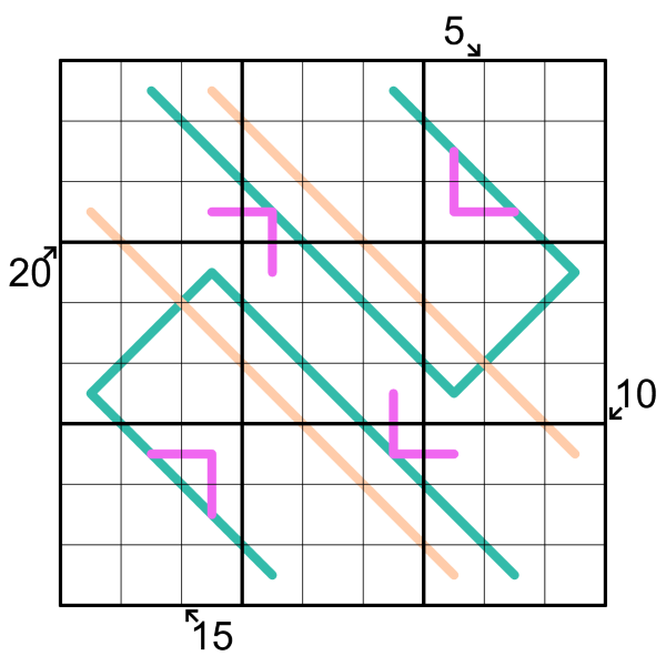 - Along apeachentropic line any set of three sequential cells must contain a low {1,2,3}, middle {4,5,6}, and high {7,8,9} digit.