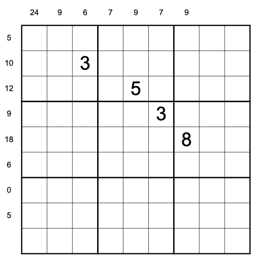 Runsums: Clues outside the grid give the sum of all digits that are consecutive with at least one of the adjacent digits in the corresponding row or column. For example, a row with digits 167853249 would have outside clue 26 = (6+7+8) + (3+2).