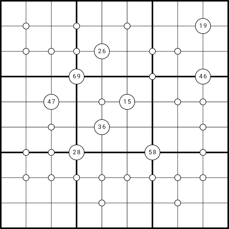 Kropki Diagonals: All diagonal pairs of cells that contain consecutive cells are marked with a small or large white dot in the intersection of four cells.