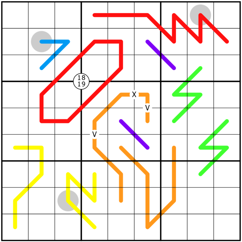 • Lines of different sizes (colored for your convenience) are given in the grid. Exactly one line of each size is a renban line, and the rest are region sum lines.