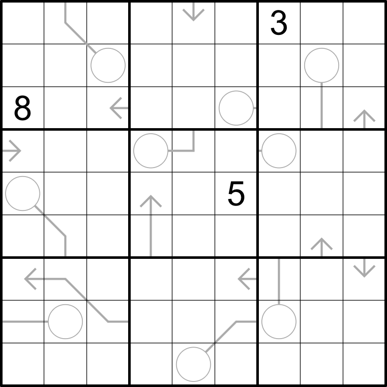 Arrows: Box borders have chopped all arrows into 2 sections and all arrow segments have been scattered throughout the grid. It is your job to deduce which arrow circles connect to which arrow tips. The direction in which lines enter/exit boxes is purely aesthetic. All arrow circles need to connect with exactly one arrow tip. The number in the circle of an arrow indexes the box number of its arrow tip and no two circles index the same arrow tip. Digits along an arrow must sum to the digit in its circle.