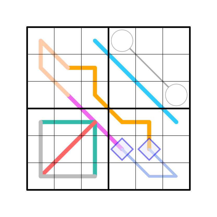 This puzzle was set for round 7 of the first Skunkworks League competition season hosted by damasosos92, in which participants get a few weeks to set a puzzle per round. For this round, among other constraints, puzzles had to be a quattroquadri. At least 8 different standard, local variants had to be used, and each could be used exactly once. Furthermore, contestants were to aim for a 2-3 star difficulty level on LMD.