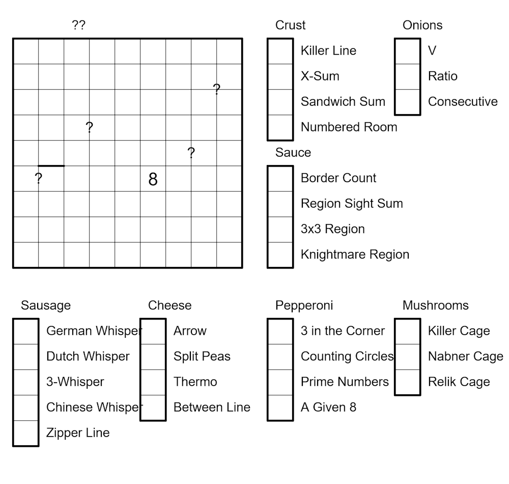 Ingredients: Clues are arranged by ingredient. No cell seen by a clue may border any cell by a different clue of that same ingredient, not even diagonally. (Except for the pepperoni!) For example, there is an ingredient called "crust". It contains several clues, such as a Sandwich Sum and a Numbered Room. If a Sandwich Sum sees cells r3c4 to r3c7, A Numbered room cannot see any cell bordering those cells.