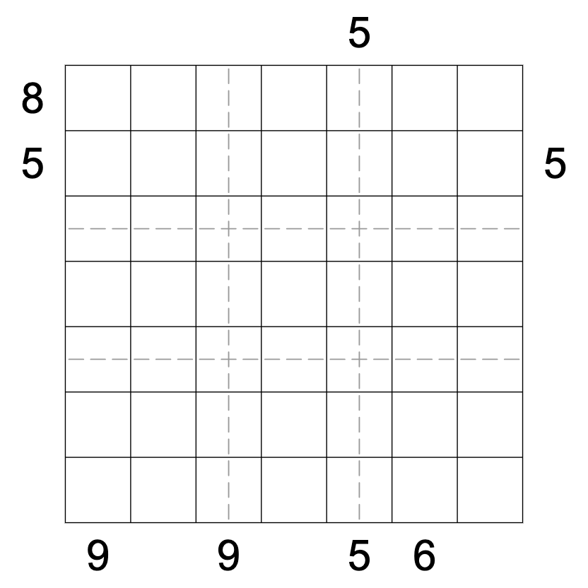 Numbered Rooms: Clues outside the grid indicate the digit which has to be placed in the Nth cell in the corresponding direction, where N is the digit placed in the first cell in that direction.